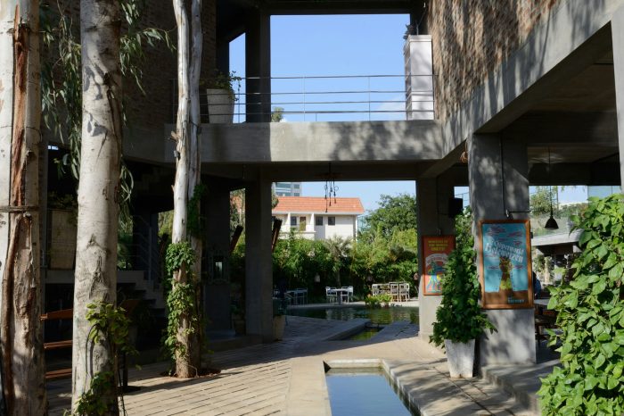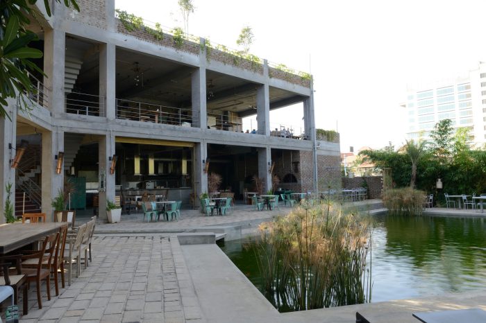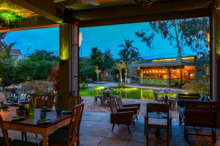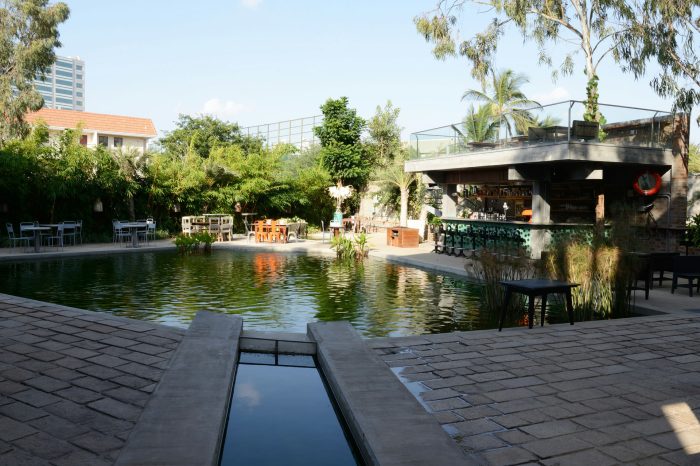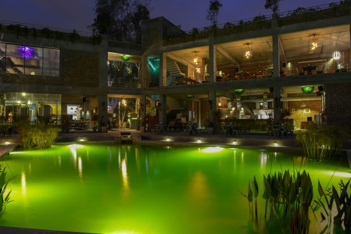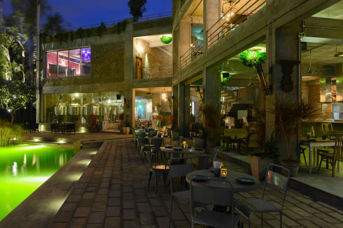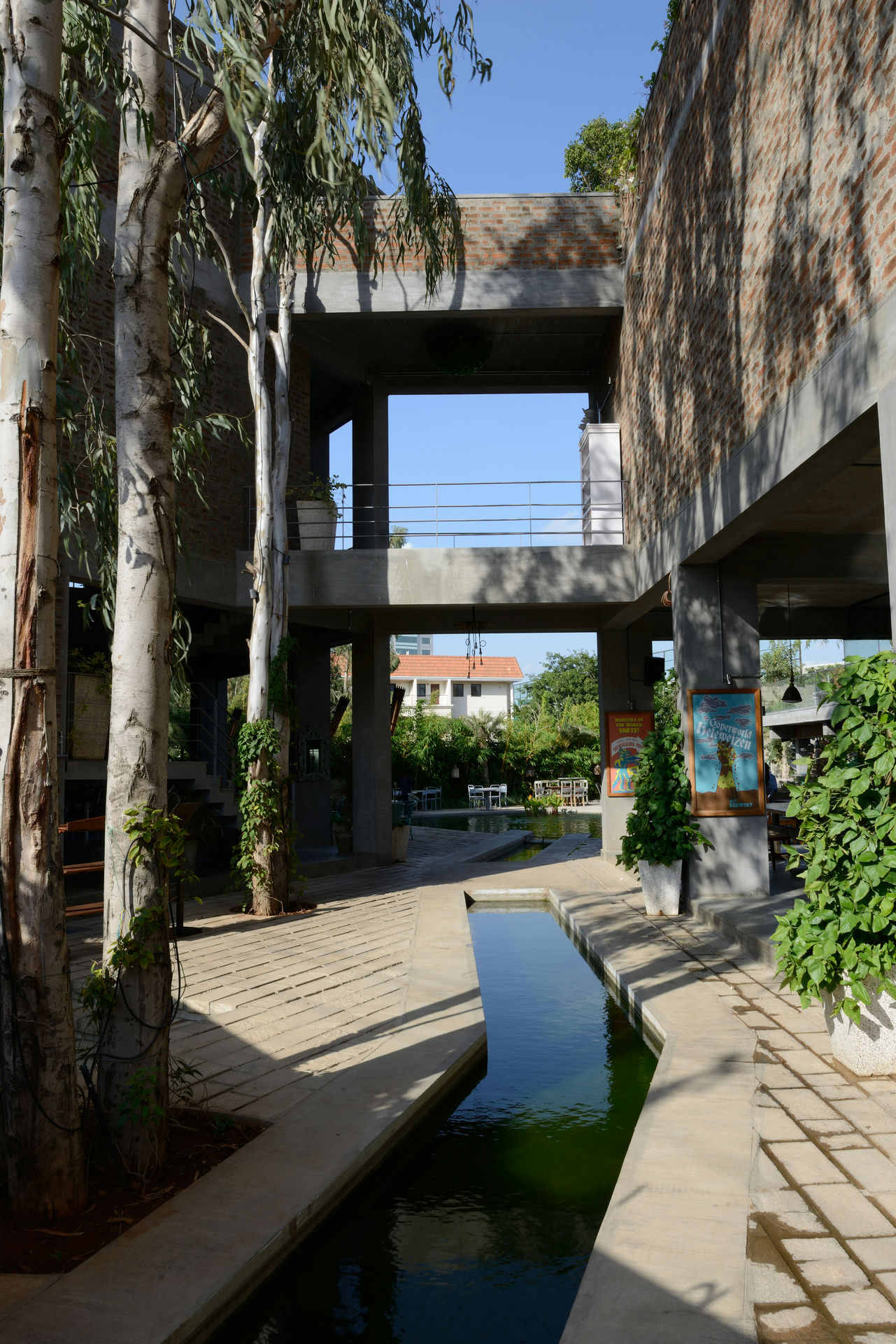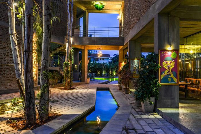 Hence as one enters from outside into the front courtyard, one only gets a glimpse of the place. However, it is the rear courtyard which reveals the real scale of the open space by having a large water-body as well as outdoor seating and bar located around it. This becomes the fulcrum of all activities with restaurants, brewery and discotheque overlooking onto it.