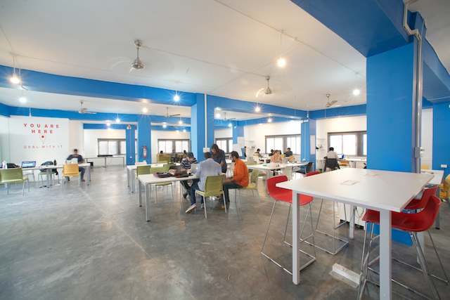 The material palette is kept very simple with cement flooring, white walls, exposed electrical conduits and is highlighted by bright colored column/beams and colored furniture. This creates a minimal yet cheerful and quirky space for the startups to work in.